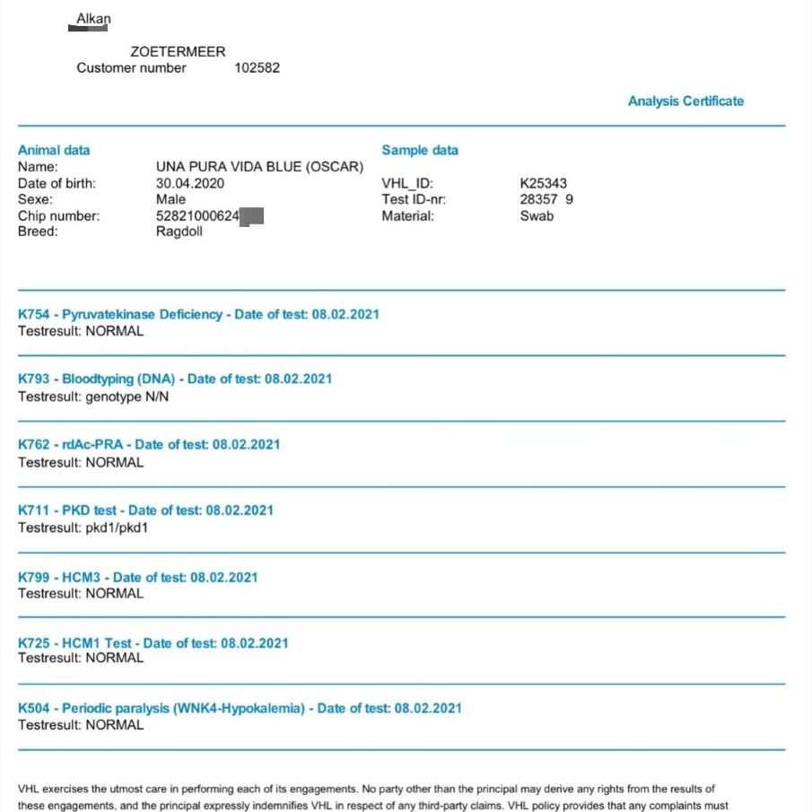 Ocar is een absolute lieverd. Hij kan met iedereen binnen de Cattery ontzettend goed overweg. Hiernaast is Oscar een absolute bewezen dekkater. Om ervoor te zorgen dat Oscar (zoals hij dat zelf graag wilt), los in huis mag lopen, hebben we ervoor gezorgd dat onze poezen aan de poezenpil zijn gestart. Oscar heeft geen last van zijn hormonen en laat de dames hun gang gaan en sproeit niet. Oscar dekt alleen wanneer het ook daadwerkelijk de bedoeling is. Oscar is FIV/ Felv negatief, DNA getest en Echo getest op HCM en PKD. Alle uitsluiten waren negatief en zijn hieronder toegevoegd.